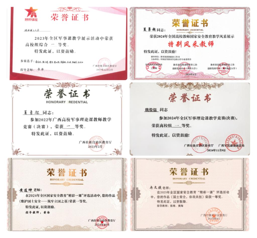 坚持以国防教育为根本,一体推进新生军训、征兵动员与教学科研工作。一是创新军训模式,增强国防教育实效。开展体验式、沉浸式特色军训,将军事训练与急救技能、消防演练、无人设备使用、情景对抗有机融合,体现“战”味、突出“兵”味、保持“军”味,军训短视频总点击量超数百万次,育人成效与社会反响显著。二是深化军地协同,构建特色教育体系。与陆军特战学院共建教学实践平台,将爱国主义、集体主义等思政元素融入课程,构建“一体两翼三结合”国防教育体系。三是坚持以赛促教,提升课程建设水平。积极组织师生参加区内外竞赛,2024年荣获全国高校教师国家安全教育教学风采展示活动最高奖“特别风采教师”;2022至2024年间,在全区军事理论课教学竞赛中荣获一等奖3项、二等奖2项,在国家安全教育“精彩一课”评选中荣获一等奖3项、二等奖2项;2023年,以总分第一名荣获全区军事课教学展示活动一等奖,指导学生在2023全区高校安全教育微电影微视频微动漫征集评选活动中获二等奖1项、三等奖1项,并在全国高校学生国家安全素养展示活动中获优秀组织奖。四是完善征兵机制,高质量完成征兵任务。建立“一人一册”预检机制,五年来组织超900名意向学生预检。连续五年超额完成征兵任务,入伍完成率均超115%以上,多次荣获桂林市、七星区征兵工作“先进单位”。