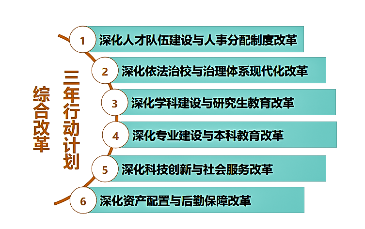 一是实施三年行动计划。坚持把深化综合改革作为破解发展瓶颈、激发内生动力的关键抓手,统筹推进体制机制创新。聚焦制约学校高质量发展的痛点难点,系统总结《深化综合改革实施计划(2018—2020年)》实施成效,科学谋划并制定新一轮《深化综合改革实施计划(2024—2026年)》。二是强化实施监控。同步制定6个专项改革实施方案,明确改革路径,细化年度任务,每年组织召开全面深化综合改革领导小组工作会议,定期研究各项改革任务的落实情况,确保各项改革举措落地见效。三是推进教育评价改革。发布《进一步深化新时代教育评价改革实施方案》,构建科学、多元、导向明确的评价体系,推动教育评价改革向纵深发展,为学校高质量发展提供持续动力。