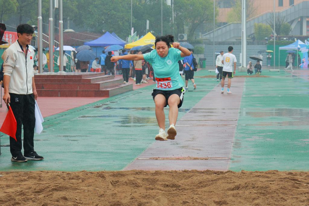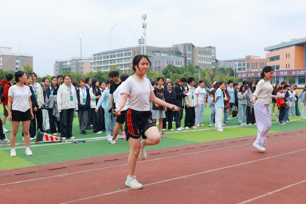 沙坑旁,外国语学院英语 24-5 班的李诗雅蹲身校准卷尺,每一次精准读数,都是对“公平”的坚守。
