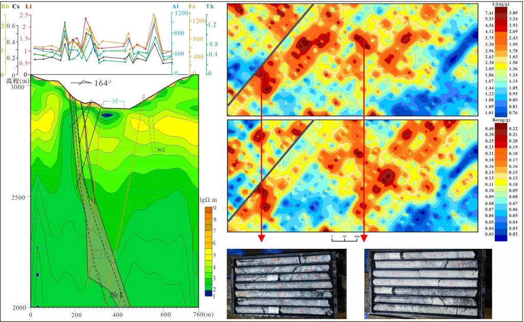 伟晶岩型单体锂矿作为重要的硬岩型锂矿,以规模大、品位高、提锂效率高的特点,成为全球锂资源的核心来源。学校地电化学勘查技术团队与四川省第三地质大队长期深度合作,以亚洲迄今探明规模最大的伟晶岩型单体锂矿——木绒锂矿及其外围区域为研究基地,开展系统性深部找矿预测。团队创新应用地电化学勘查技术,系统测量地表介质中锂、铍、铌、钽等元素的异常分布,成功识别出与隐伏伟晶岩体高度吻合的指示元素峰值区,并结合音频大地电磁测深技术实现对深部电性结构的高精度解析。经钻探工程验证,该成果成功指导新增锂资源量30余万吨,极大拓展了木绒锂矿的资源潜力,为我国新能源产业发展注入关键资源动力。