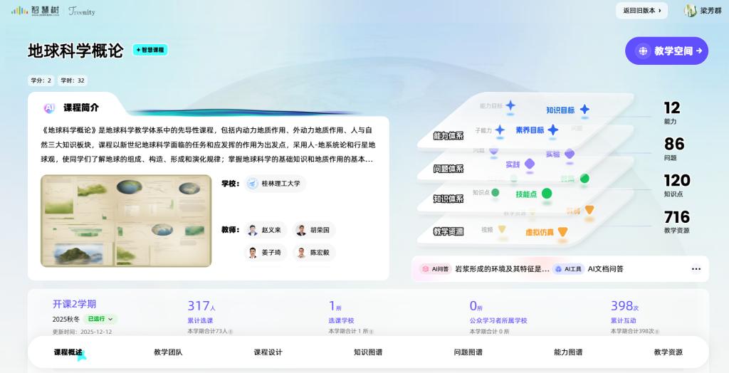 强化人工智能赋能的 AI+课程建设,构建“AII(AI+IP+IE)”课程体系,即面向全校专业开设人工智能通识必修课1门(AI),各专业开设2-3门数智赋能交叉融合专业课程(IP)及若干门数智赋能课程(IE)。作为区内6所高校开展人工智能通识课试点工作,面向学生开设选修课。全校全面开设人工智能通识必修课(32学时)。推动全校课程信息化、智慧化、数智化建设,目前已建成《地球科学概论》等智慧课程37门。