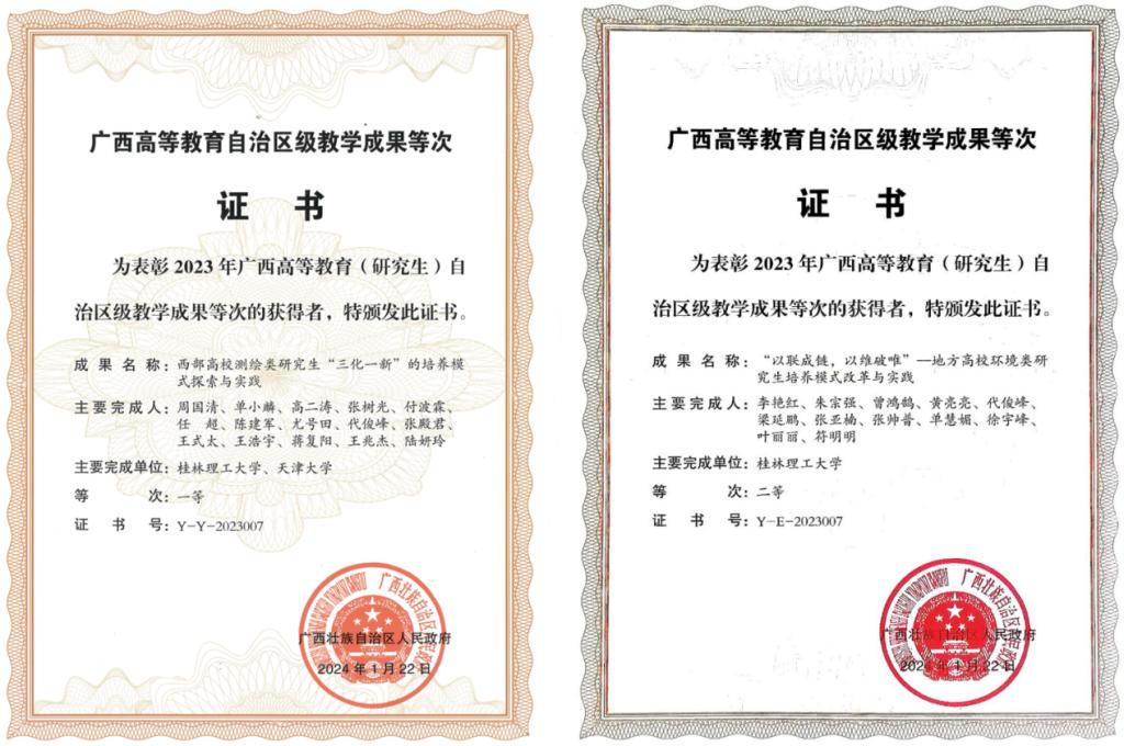 研究生课程建设亮点突出。2023年,研究生课程《现代成矿理论与勘查技术》获评自治区级课程思政示范课程,其负责人及团队获自治区级课程思政教学名师和团队认定,研究生公共管理研究教学团队被认定为自治区级课程思政示范基层教学组织。研究生联合培养基地提质扩面。与66家单位建立合作,建成23个区级、91个校级研究生联合培养基地;2023年,3个基地入选第一批广西示范性研究生联合培养基地。研究生教学成果等次实现新突破。Beat365官网作为第一完成单位,斩获自治区级研究生教学成果一等、二等等次各1项。研究生学科竞赛成果丰硕。五年来,学生获学科竞赛国家级一等奖60余项、二等奖150余项、三等奖220余项,省部级特等奖80余项、一等奖580余项、二等奖900余项、三等奖1100余项。