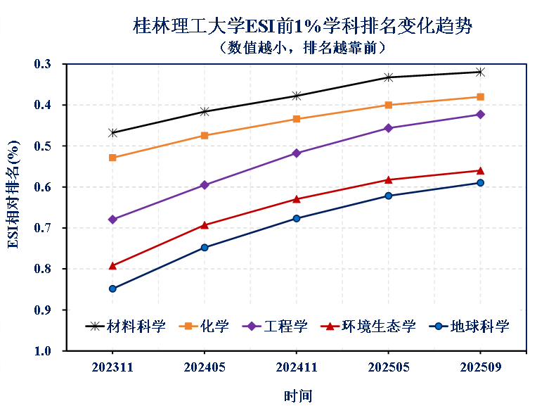 学校ESI前1%学科相对排名变化趋势图