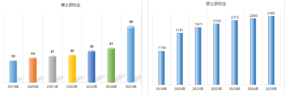 博士招生总量翻番,2025年新增专业学位博士招生,实现学术型与专业型并驾齐驱的“双轨并行”;硕士招生规模扩大一倍,非全日制录取人数同步翻倍,形成全日制与非全日制协调发展的“双轮驱动”;5年来,年招生总量由1198人(博士39人,硕士1159人)增至2464人(博士99人,硕士2365人),扩容超一倍,研究生教育迈入规模化、多元化发展新阶段,成为学校高质量发展的“强引擎”与“动力源”。