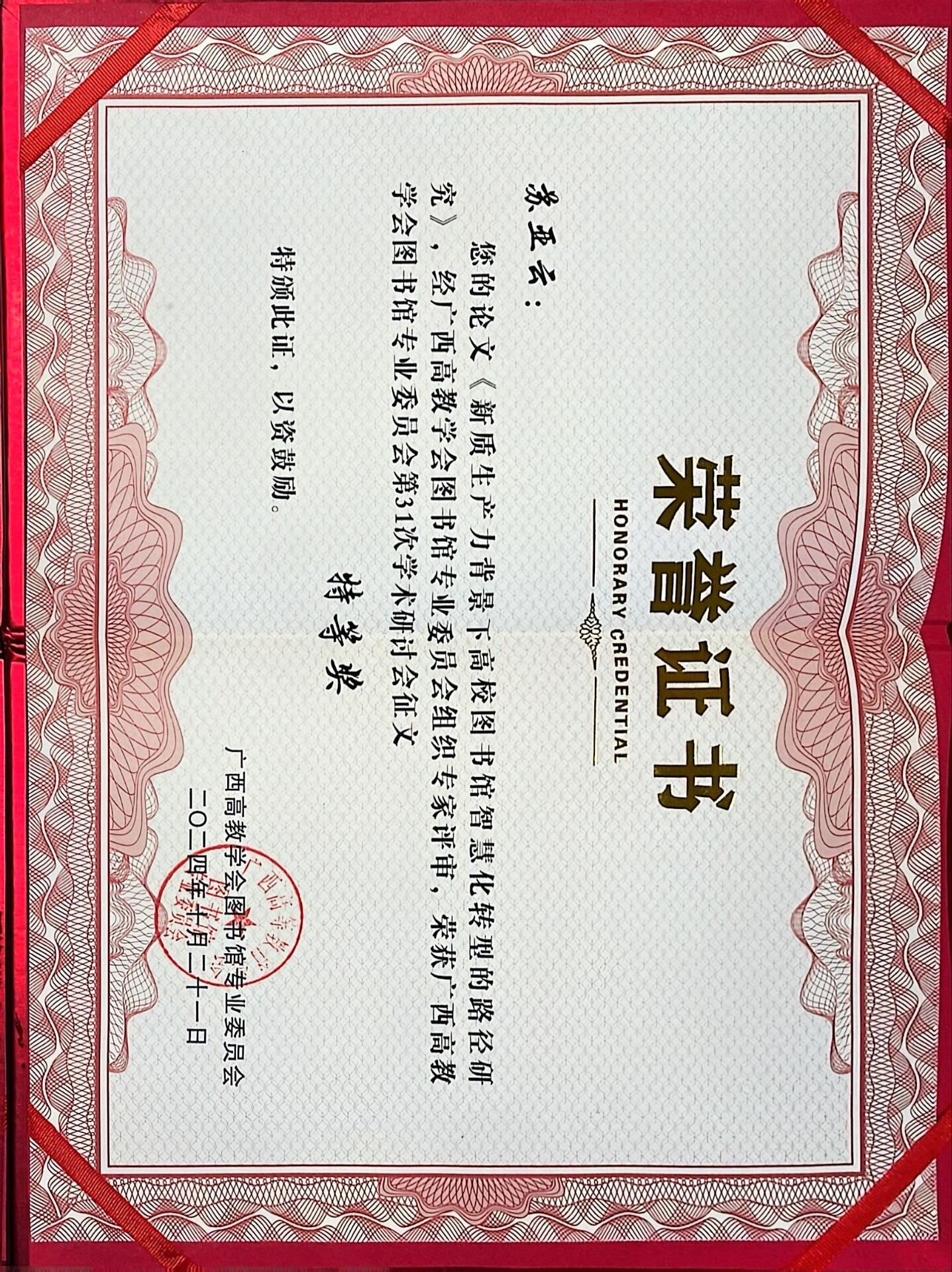 图书馆苏亚云老师论文获得广西高教学会图专委征文特等奖