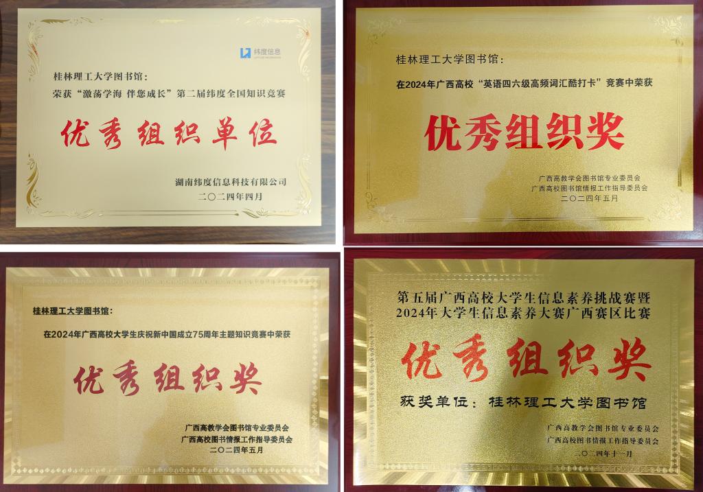 注重以理论研究推动业务提升,馆员团队在2024年桂林市图书馆学会业务技能大赛中荣获团体第二名,位列桂林高校图书馆首位;获省级及以上学会“优秀组织奖”10次。获批教育部课题1项、中国图书馆学会课题1项、自治区级课题2项;16篇论文在征文比赛中获奖,7个案例获评桂林市优秀案例;5人次获“优秀指导教师”称号,专业化馆员队伍建设成效显著。