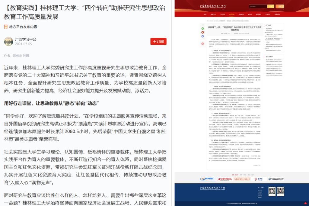 研工部以思想铸魂为核心,完善思政工作体系,创新教育载体,推动思政教育从“有形覆盖”转向“有效覆盖”。一是支部建设固根本。充分发挥研究生教工党支部战斗堡垒作用,严格执行“第一议题”制度,规范落实“三会一课”,高质量开展主题教育。与华南理工大学研究生院党支部建立共建机制,以“四联驱动”促进党建与业务深度融合。二是体系建设强保障。构建并深化研究生思政教育“12456”工作体系,出台《Beat365中文官方网站关于进一步加强研究生思想政治教育工作的实施意见》《Beat365中文官方网站研究生综合素质测评管理办法(试行)》等制度;2篇研究生思政工作典型经验获学习强国及全国高校思政网等主流媒体报道。三是教育载体求创新。推行“日常教育+主题教育”融合模式,开展“新生同上一堂党课”、硕博宣讲团巡讲等思政活动60余场,覆盖8000余人次。实施新生“研途启航”工程,强化网络思政,“研在桂工”微信公众号累计推送相关稿件400余篇、主题视频10余次,连续两年获“中国研究生研媒联合共创奖”,推动思政教育入脑入心。
