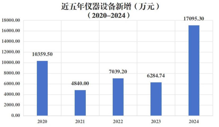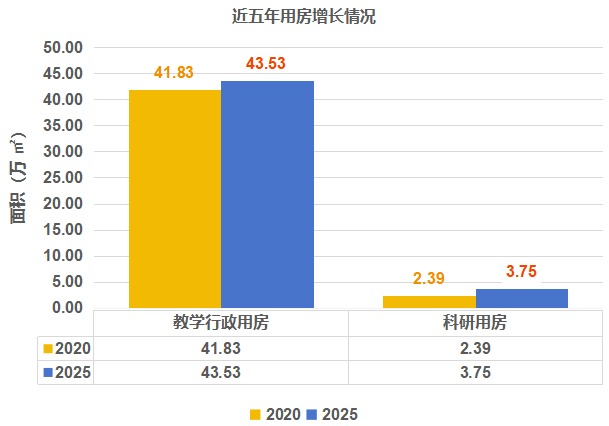 当前,学校已形成覆盖教学、科研、行政的硬件支撑体系:教学行政用房共58万㎡,含行政用房5万㎡、教学用房53万㎡,为日常教学运行与行政服务提供充足空间;建有校外实习基地3个,搭建理论与实践衔接桥梁;科研专门用房总面积3.7万㎡,为科研攻关提供专属阵地。仪器设备方面,五年来,教学行政用房增长1.7万平方米,专用科研用房增长1.36万平方米;仪器设备累计新增4.6亿元,当前账面价值达11.34 亿元,占固定资产总额36.8%。其中单台20万元(含)以上设备583台件、价值4.1亿元,集中分布在材料、环境等7个学院,呈现 “优势学科集中化”特点。