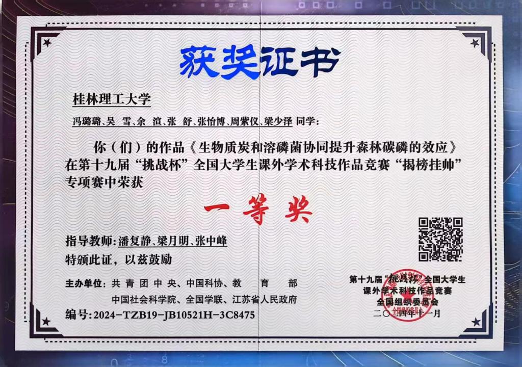 获得第十九届“挑战杯”全国大学生课外学术科技作品竞赛2024年度“揭榜挂帅”专项赛国赛一等奖